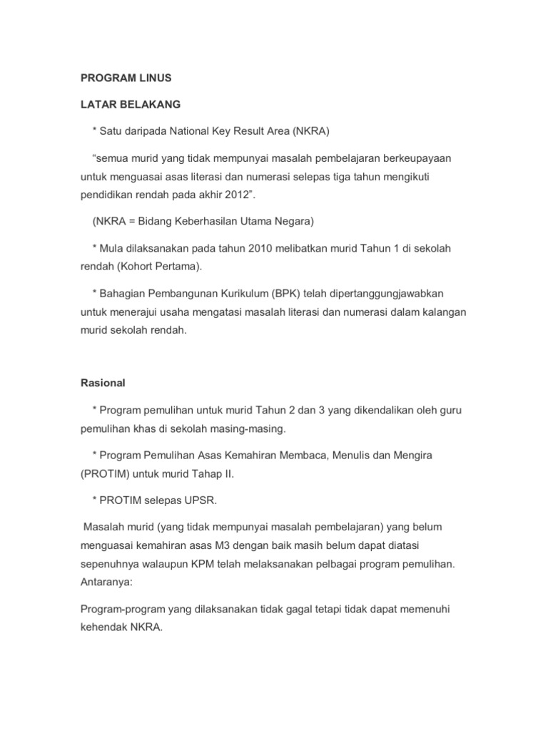 Ibu bapa perlu mendidik anak FNFK Ibu à inti. 6 bidang utama nkra. PELAKSANAAN PROGRAM LITERASI DAN NUMERASI LINUS DI SEKOLAH RENDAH The Implementation of Literacy and Numeracy LINUS Program at Primary School CHEW FONG PENG fpchewumedumy Universiti Malaya LINUS yang dilaksanakan sejak tahun 2010.